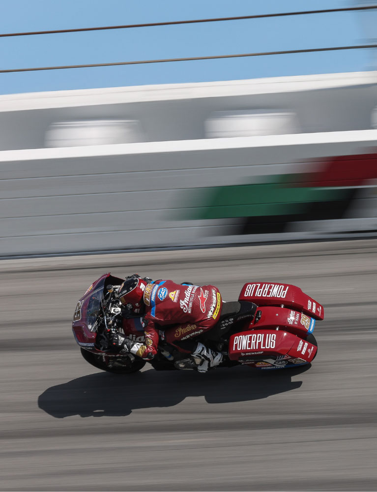 In 1909 wonnen we de allereerste motorwedstrijd op de Indianapolis Motor Speedway. In 1937 behaalde Ed Kretz de eerste Daytona 200 op een Indian Sport Scout. De originele Wrecking Crew domineerde het racecircuit na de oorlog. Die traditie zetten we voort met Flat Tracking Racing in de jaren na 2010. De rijders van vandaag doen hetzelfde bij de Bagger Racing League Europe en de MotoAmerica King of The Baggers-serie. Verschillende tijdperken. Zelfde resultaat.